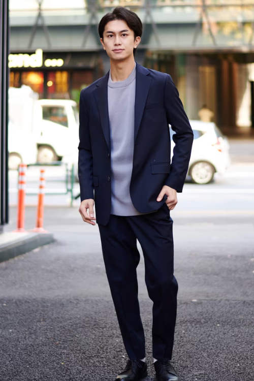定番のスーツスタイルは、インナーによってさまざまな印象に変化させられますね。