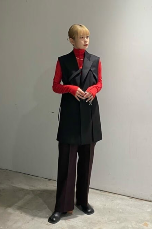 インナーにシアー感のあるビビットカラーを持ってくることで、個性的でこなれたコーデになっていますね。